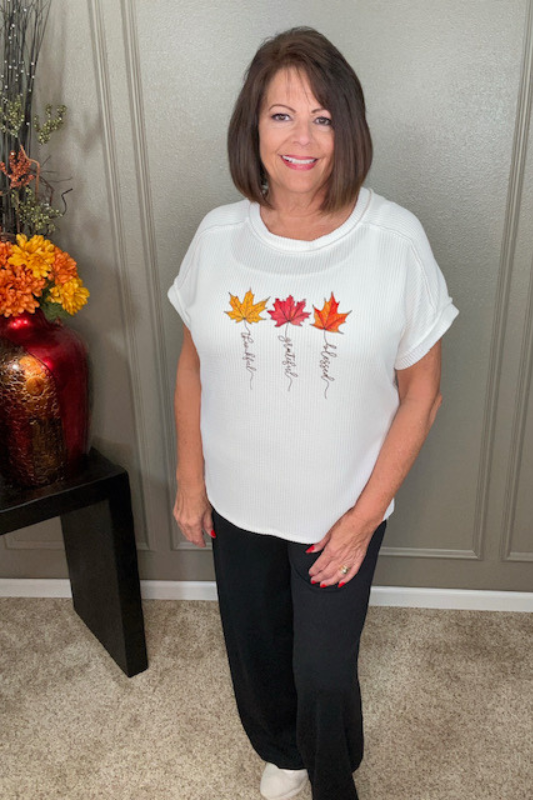 - Details: Round neckline, ribbed fabric, side slit, seam detail, butter soft feel, relaxed look, 2 inches longer in the back, drop shoulder, short sleeve, FALL LEAVES: Thankful, Grateful, Blessed