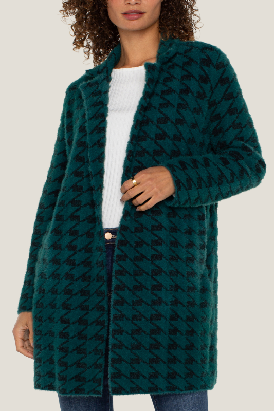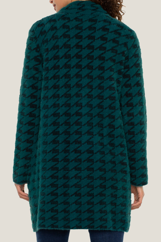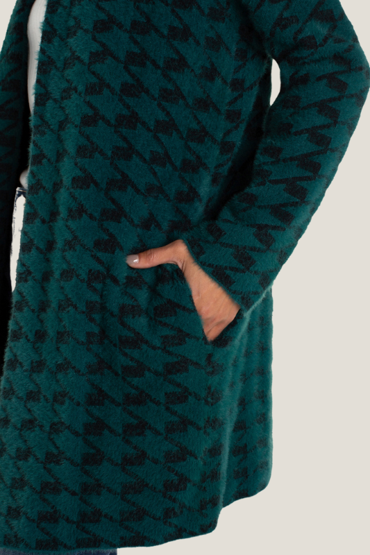 - Details: Houndstooth print, lapel collar, cardigan style, front pockets, very soft fuzzy feel, seamless look, thigh length